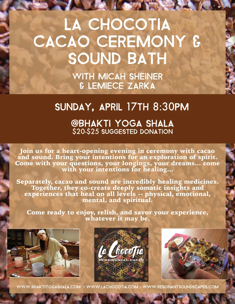 Separately, cacao and sound are incredibly healing medicines. Together, they co-create deeply somatic insights and experiences that heal on all levels -- physical, emotional, mental, and spiritual.