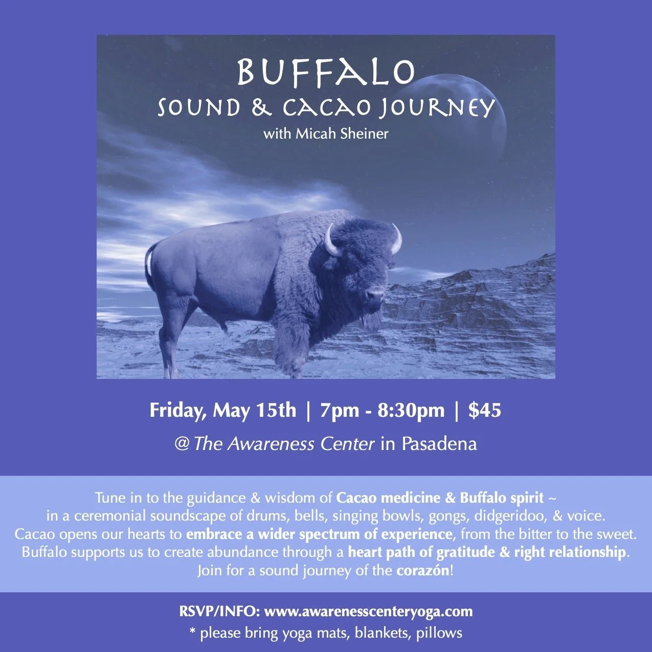 Buffalo Friday, May 15, 2026 7:00 PM 8:30 PM 19:00 20:30 Awareness Center Yoga 2801 East Foothill Boulevard Pasadena, CA, 91107 United States (map) Google Calendar ICS